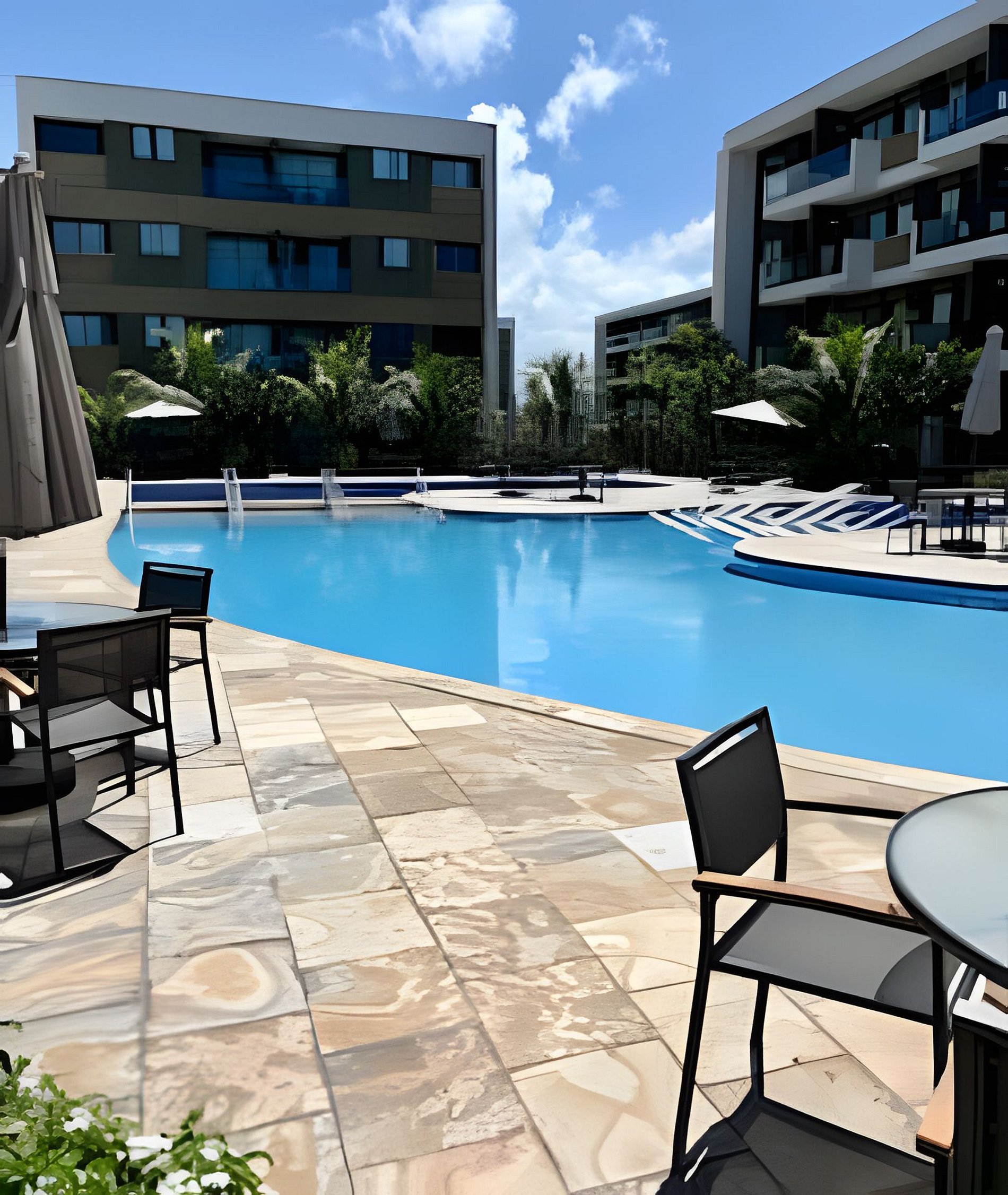Piscinas amplas (adulto e infantil) com área de lazer